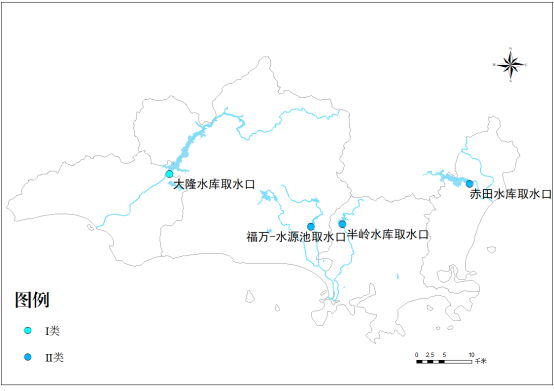 2026年2月,大隆水库在用城市集中式饮用水水源地取水口水质为地表水Ⅰ类,福万-水源池水库、半岭水库、赤田水库3个在用城市集中式饮用水水源地取水口水质均为地表水Ⅱ类,水质优比例为100%。具体情况详见表1、图1。