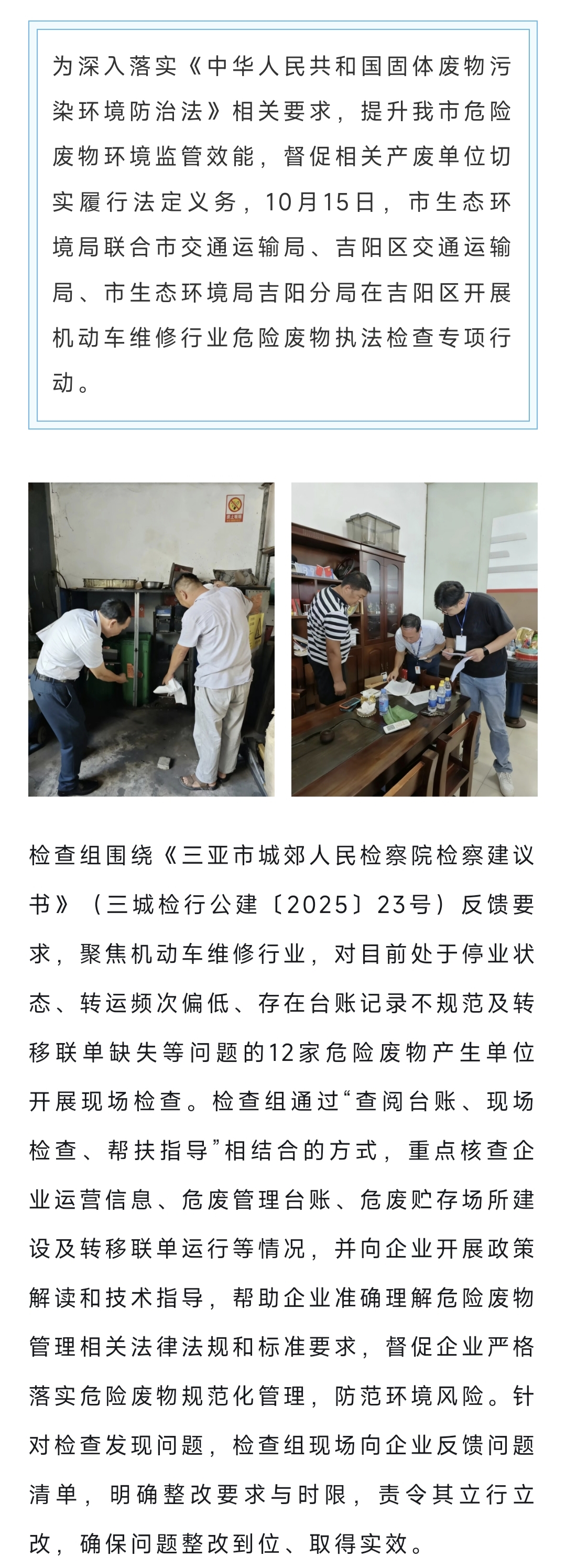 市生态环境局开展机动车维修行业危险废物执法检查专项行动